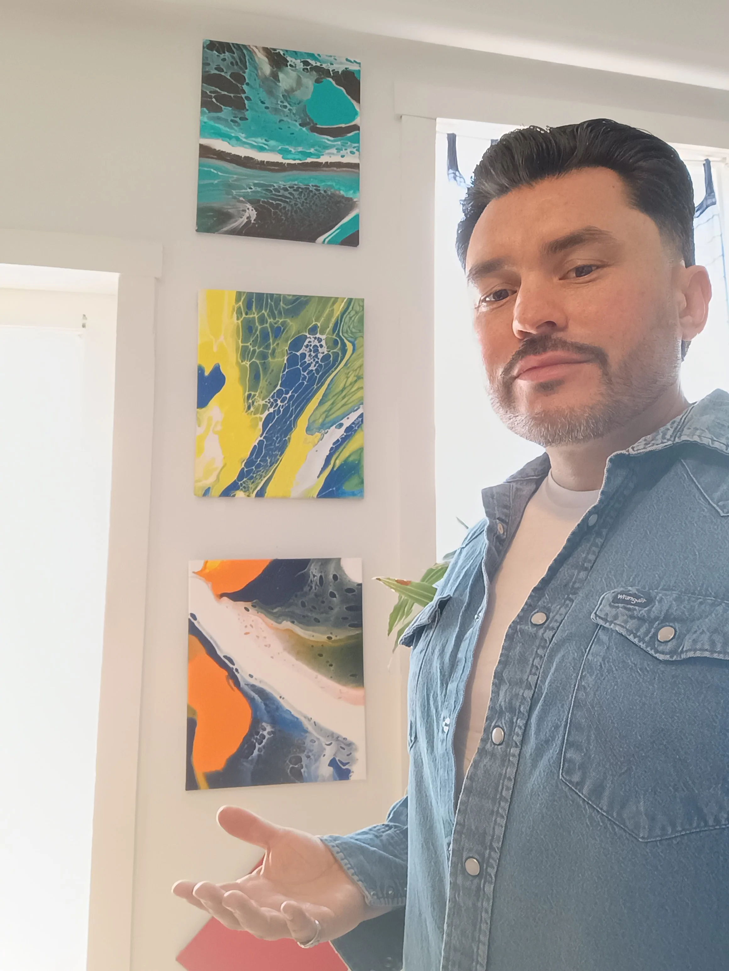 Crescencio inside his West Berkeley art studio, standing beside a vertical triptych of small format fluid works. Each piece reflects his signature use of movement, contrast, and layered color - a visual language that captures both chaos and clarity.
